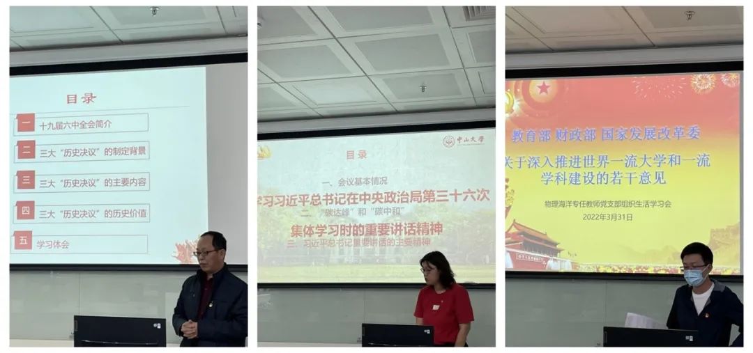 雷亚平、刘姗、熊海仙三位同志分别以“加强党史理论学习、推进全面从严治党”、“碳达峰碳中和目标和绿色高质量发展”、“深入推进世界一流大学和一流学科建设”为主题带领支部成员集体学习。