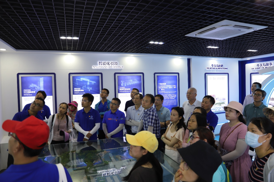 2010年,港珠澳大桥沉管预制厂建造在牛头岛开工,仅14个月就在一无所有的牛头岛上建成了总投资额10亿人民币的世界最大沉管预制工厂。党员们参观了牛头岛和深中通道文化展厅,进一步了解了港珠澳沉管隧道的建造历史和深中通道沉管预制的艰巨任务。