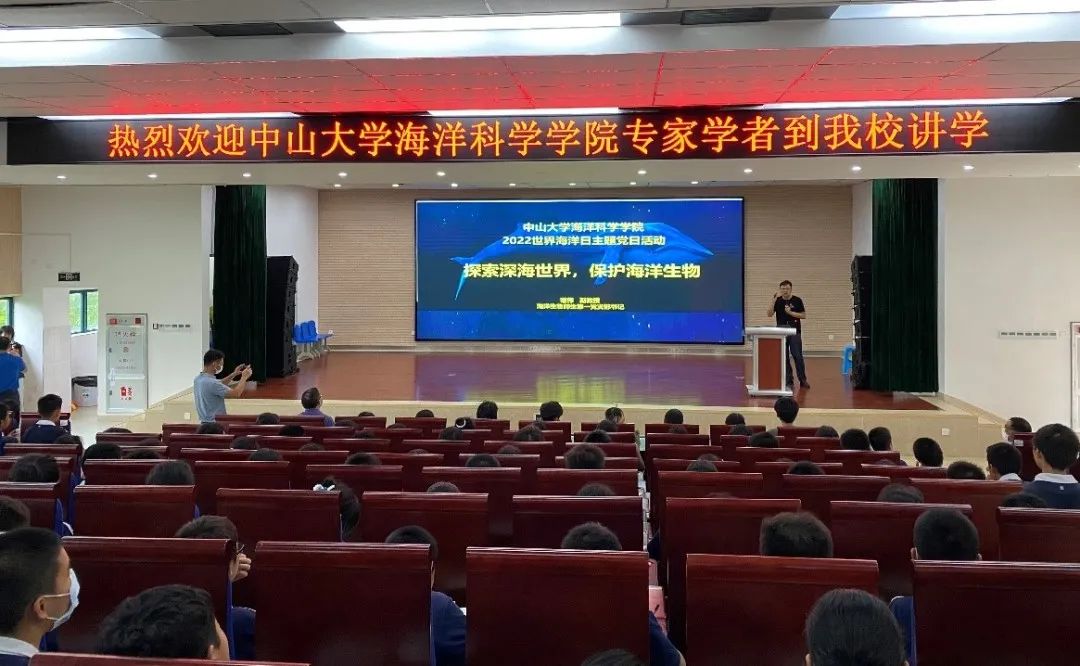 6月6日下午,在第十四个“世界海洋日”和第十五个“全国海洋宣传日”到来之际,我院海洋生物师生第一党支部赴珠海中山大学附属中学,与珠海中山大学附属中学党支部联合开展世界海洋日主题党日活动,我院党委副书记廖喜扬、珠海中大附中常务副校长罗朝猛和党支部书记黄宏志及双方党支部成员参加活动。支部书记谢伟副教授为中学生们主讲题为“探索深海世界,保护海洋生物”的海洋科普讲座,向同学们普及海洋生态系统科普知识,宣传保护海洋生态环境的理念,提升同学们的海洋保护意识。