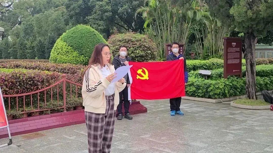 随后,全体培训班学员在彭湃同志铜像前,面向党旗庄严举行新党员入党宣誓暨老党员重温入党誓词仪式。学院党委廖喜扬副书记讲话,他首先代表开元(中国)党委向新入党的同志表示祝贺。他表示,彭湃同志心系百姓疾苦、敢为人先的革命事迹,见证着革命先烈抛头颅、洒热血的光辉历程的红宫红场旧址,正无声激励着我们沿着先烈开创的道路奋勇开拓前进。他勉励党员同志们要永葆初心,勇担使命,终身践行入党誓词,时刻严格要求自己,务实进取追求卓越,发挥好先锋模范作用,坚定理想信念,通过实际行动践行全心全意为人民服务的宗旨。紧接着,在廖喜扬副书记的带领下,全体党员同志庄严宣誓,面对鲜红的党旗,同志们斗志昂扬、神情坚毅,以饱满的精神状态和有力的声音表明自己为党和国家的事业奋斗终身的坚定决心,郑重表达对党最炽烈的热爱、最坚定的信念与忠诚。宣誓完毕,本科生第二党支部黎梦真同志代表新党员发言,她表示,作为一名党员,应该不断加强党性修养,以更严的标准要求自己,把激昂的青春融入伟大的中国梦,为祖国的发展贡献自己的光和热。本科生第一党支部潘皓同志代表老党员发言,他表示,作为党员作为新时代青年,我们要主动学习革命先烈的精神,不断提高政治理论水平,努力学习,开拓创新,发挥先锋模范作用,为海洋强国事业贡献自己的青春力量。