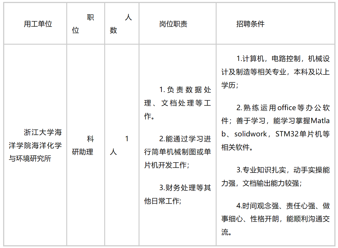 根据工作需要,浙江大学海洋学院海洋化学与环境研究所王奎课题组拟招聘科研助理1名,按照公开招聘、全面考核、择优录用的原则,工作地点在浙江大学舟山校区。请应聘者将个人简历、毕业证扫描件及其他证明本人能力的材料发送至电子邮箱kwi@zju.edu.cn,邮件主题请以“姓名+应聘岗位 ”形式命名。经面试考核后择优录取、待遇面洽。具体招聘岗位及要求详见附件。