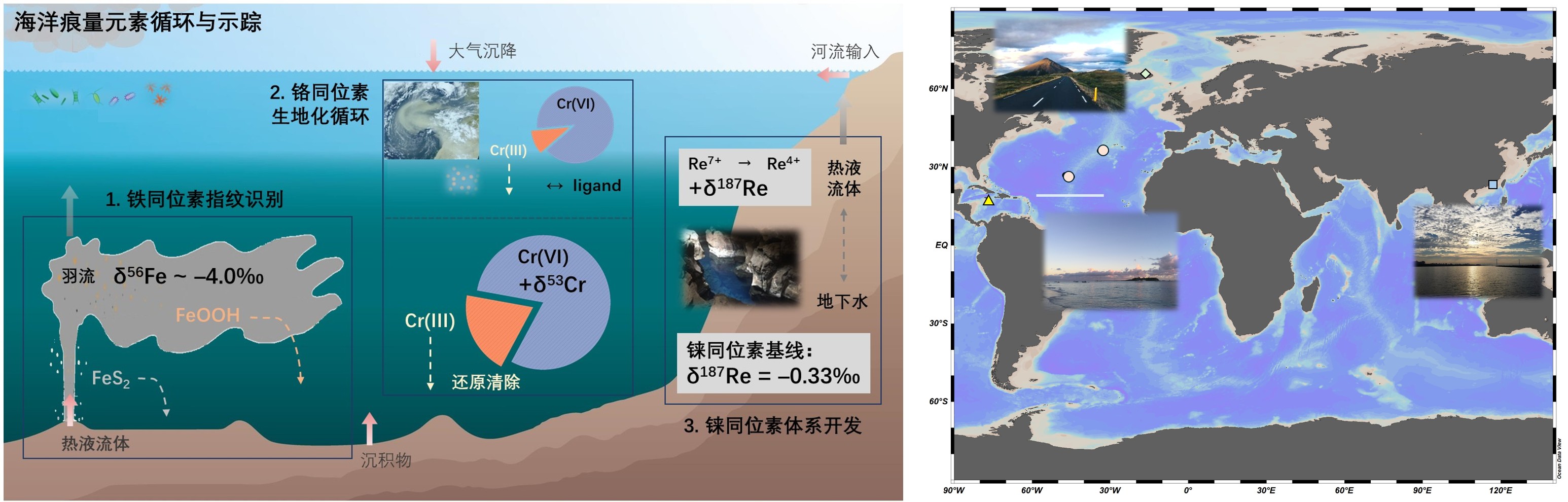 在国际上较早针对热液系统和大洋海水中Fe、Cr、Re元素的同位素地球化学行为进行了探索。现主要方向是结合现场采样与控制实验分析,拓展新兴金属稳定同位素的示踪意义,以期为古海洋、气候变化和环境问题研究提供新的视角。